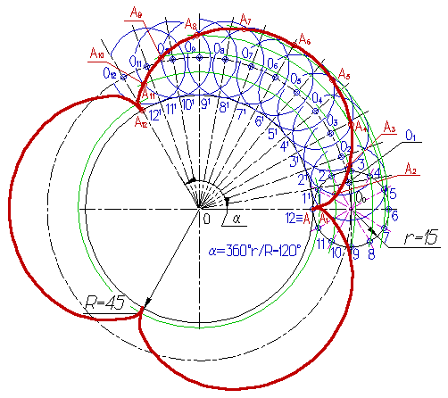 Цветок имеет ярко выраженную циклическую закономерность, поэтому чертеж выполняется на основе эпициклоиды. Сложность данного задания состоит в том, что в общем курсе черчения и графики построение эпициклоиды не рассматривается.