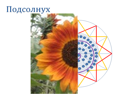 В результате исследований было установлено, что семена подсолнуха расположены в цветке по принципу спирали Архимеда. А чтобы построить лепестки, надо разделить окружность на равные части. Значит, чертеж будет содержать два вида геометрических построений: деление окружности на 12 (в нашем случае) равных частей, и построение спирали Архимеда.
