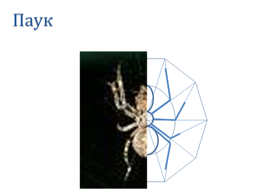 По имеющемуся изображению (рисунку, фотографии) учащиеся должны выделить виды геометрических построений, присутствующих у данного организма. Так как паук имеет восемь лап, то ведущим построением будет деление окружности на 8 равных частей.