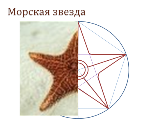 Рассмотрев фотографию морской звезды, мы видим, что она имеет пять лучей. Значит построение чертежа будет основано на делении окружности на пять равных частей. Кроме того, морская звезда имеет плавные переходы между лучами, поэтому мы будем использовать сопряжение двух прямых. Также, следует отметить, что лучи морской звезды расположены по принципу поворотной симметрии пятого порядка, которая встречается в живой природе очень редко.
