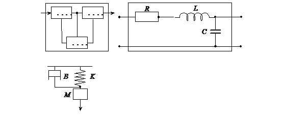 Аналитический способ применяется для построения моделей объектов хорошо изученной природы. В этом случае имеется вся необходимая информация о свойствах объекта, но она представлена в другой форме. В результате идеализации физических объектов появляются структурные модели в виде схем с сосредоточенными компонентами (рис.2, а ). Типичными представителями физических систем, допускающих такое представление, являются электрические и механические объекты. На рис.2, б изображена электрическая схема; рис.2, в представляет собой пример механической поступательной системы.