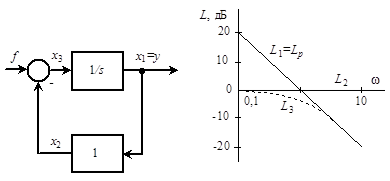 Рассмотрим пример системы, образованной интегрирующим звеном, охваченным единичной отрицательной обратной связью (рис.20, а ). На рис.20, б изображены ЛАЧХ L 1 и L 2 этих звеньев. На частотах w < 0,1 с-1 усиление контура превышает 20 дБ.