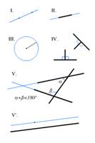 5. Если прямая, пересекающая две прямые, образует внутренние односторонние углы, меньшие двух прямых, то, продолженные неограниченно, эти две прямые встретятся с той стороны, где углы меньше двух прямых.