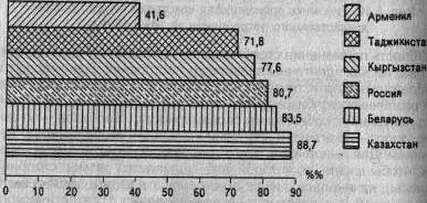 Рис. 5. Общий объем промышленного производства в странах СНГ в I квартале 1995 г. (в% к I кварталу 1994 г).