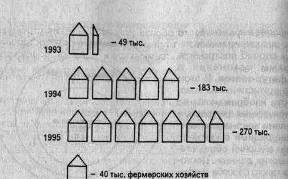 Примем условно за один знак 40 тыс. фермерских хозяйств. Тогда число хозяйств в России в 1993 г. в размере 49 тыс. будет изображено в количестве 1,22 хозяйства, в 1994 г. - 4,6 хозяйства и т.д. (рис.5.15).