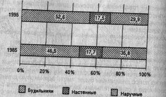 Рис. 9. Динамика удельного веса производства часов по видам (1985-1995 гг.)