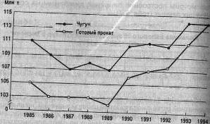 Рис. 12. Динамика производства чугуна и готового проката в регионе за 1985-1994 гг.