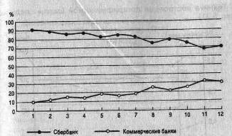 Рис. 13. Доли вкладов граждан в Сбербанк и коммерческие банки в одном из городов в 1995 г. (%)