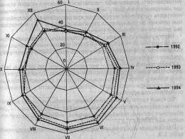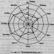 Построение замкнутых диаграмм сводится к следующему: вычерчивается круг, среднемесячный показатель приравнивается к радиусу этого круга. Затем весь круг делится на 12 радиусов, которые на графике приводятся в виде тонких линий. Каждый радиус обозначает месяц, причем расположение месяцев аналогично циферблату часов: январь - в том месте, где на часах 1, февраль - 2, и т.д. На каждом радиусе делается отметка в определенном месте согласно масштабу исходя из данных за соответствующий месяц. Если данные превышают среднемесячный уровень, отметка делается за пределами окружности на продолжении радиуса. Затем отметки различных месяцев соединяются отрезками. В приведенном примере (рис.5.23) К = 44,8 тыс. т, длина радиуса - 3,0 см. Следовательно, 1 см = 44,8: 3,0 " 15 тыс. т.д.анная замкнутая диаграмма наглядно показывает, что производство мяса подвергнуто сезонным колебаниям. Минимум производства мяса приходится на апрель, май, затем наблюдается медленное его повышение к августу, резкий подъем в сентябре, октябре и опять спад в декабре, январе. Если же в качестве базы для отсчета взять не центр круга, а окружность, то диаграммы называются спиральными.