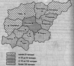 Рис. 19. Плотность населения в областях Центрального района России (человек на 1 м2 )