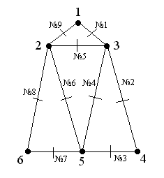 Наочно граф можна уявляти як геометричну конфігурацію ( див. рис.1.7), яка складається з точок (вершин графу 1,2,3,4,5,6) і ребер (ліній або відрізків №1(1-3), №2(3-4), №3(4-5), №4(3-5), №5(2-3), №6(2-5), №7(5-6), №8(6-2), №9(2-1), які сполучають деякі точки (вершини) за вибраним алгоритмом обходу вершин графу) [5].