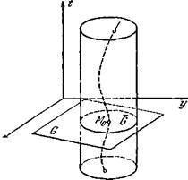 Функции Р (х, у) и Q (х, у) нужно при этом рассматривать как функции трех переменных х, у и t. Но так как эти функции от tне зависят, то в трехмерном пространстве R3 областью определения правых частей системы (I) является бесконечная цилиндрическая область Н, образованная всеми прямыми, параллельными оси t, пересекающими плоскость (х, у) в точках области G.