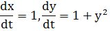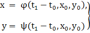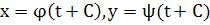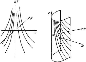 Рассмотрим обычную для системы двух дифференциальных уравнений с двумя неизвестными функциями геометрическую интерпретацию, т. е. геометрическую интерпретацию в трехмерном пространстве с декартовыми координатами х, у, t.