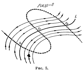 меньше 0, а вне — больше нуля. Сравнивая векторные поля систем (66) и (69), нетрудно видеть, что все замкнутые траектории системы (66) (рис. 23) являются циклами без контакта для траекторий системы (69).
