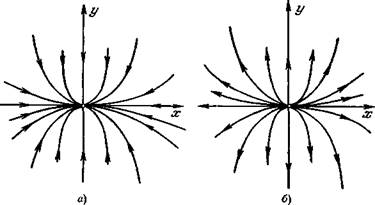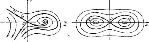 , то семейство кривых (64) имеет вид, представленный на рис. 21. a, а семейство кривых (63) — вид, представленный на рис. 21, б. Состояние равновесия О (О, 0) лежит на интегральной кривой (63) при С = 0. Эта интегральная кривая состоит из четырех траектории состояния равновесия О, двух незамкнутых траекторий, одна из которых стремится к О при t