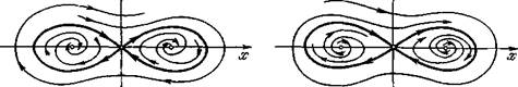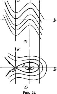 Отсюда следует, что траектории системы имеют вид, указанный на рис. 20. Второе из уравнений (60) показывает, что если траектория проходит через точку