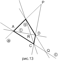 Указанные стороны называются вершинами, прямые- сторонами четырёхвершинника. Вершины - A, B, C, D. Стороны- a, b, c, d, s, t (рис. 13).
