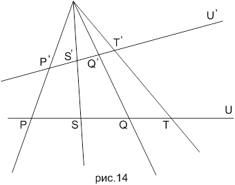 Т. e. если P, Q и S, T гармонически сопряжённые пары, то после проектирования из некоторого центра O на прямую и получим тоже гармонически сопряжённые пары P/ , Q/ и S/ , T/ .