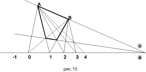 Они в пересечении с прямой 1 дадут точки (1, 0) и (1, 1). Далее проведём через т. O и (1, 1) прямую до пересечения с прямой u получим т. B. Соединим B и 1 и найдём точку пересечения прямой B1 и 1. Это точка (1,2). Проектируя эту точку на прямую a из центра A получим т. 2. Она и будет той четвёртой точкой в гармонически сопряжённых парах O, 2 и 1, бесконечность. Это можно показать, рассмотрев четырёхвершинник A, B, (1, 1), (1, 2).