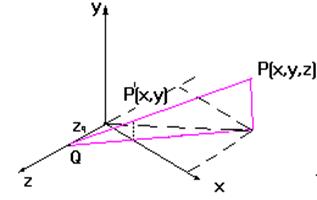 Неоднородные координаты точки P/ получаем отсюда : X=x/(1-z/zq ) , Y=y/(1-z/zq ) ,Z=0