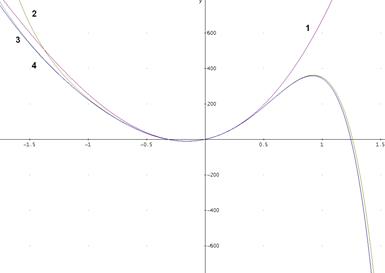 Де 1 - графік наближеного рішення для трьох членів ряду; 2 - графік наближеного рішення для шести членів ряду; 3 - графік наближеного рішення для дев'яти членів ряду; 4 - графік точного рішення.
