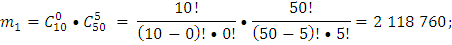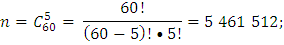 Задача 1. В партии из 60 изделий 10 – бракованных. Определить вероятность того, что среди выбранных наудачу для проверки 5 изделий окажутся бракованными: