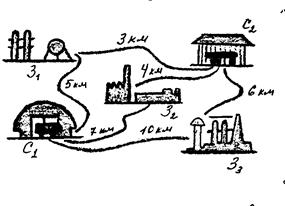 Пример 2. На три завода З1 , З2 , З3 (рис. 35) нужно завести сырьё одинакового вида, которое хранится на двух складах С1 , С2 в соответствии с данными, указанными в таблице.