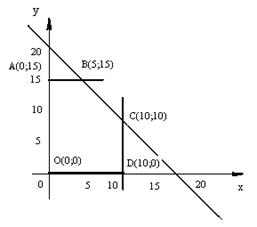 Действительно, если будет найдено наименьшее значение функции – 2х – у на многоугольнике Q , то прибавив к этому значению 290, получим наименьшее значение функции 290 – 2х – у. На рисунке 37 показано, что наименьшее значение линейной функции, рассматриваемой на многоугольнике Q , достигается в вершине С . Иначе говоря, наиболее выгодный вариант перевозок соответствует точке С (10; 10), т. е. х = 10, у = 10. Общее количество тонно-километров для этих значений х, у равно 290 – 2·10 – 10 = 260. Видно, геометрическая модель позволила полностью решить поставленную задачу.