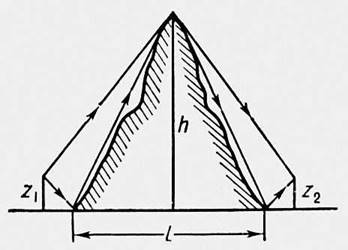 Рельеф земной поверхности также влияет на распространение радиоволн. Это влияние зависит от соотношения между высотой неровностей поверхности h, горизонтальной протяжённостью l и углом падения q волны на поверхность (рис. 7). Если выполняются условия: