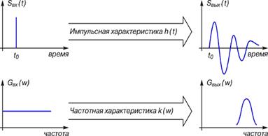 ПФ часто применяется при решении задач, возникающих в теории автоматического регулирования и управления, в теории фильтрации и т.д. Разберем один из примеров. Имеется некий линейный фильтр – изготовленный то ли в виде набора спаянных между собой резисторов, конденсаторов и катушек индуктивности, то ли в виде модульной конструкции интегральных микросхем. Известен также входной сигнал (на рис. 1 в качестве входного сигнала изображена дельта-функция, то есть импульс исчезающе короткой длительности и бесконечно большой амплитуды). Необходимо определить, какой сигнал появится на выходе нашего фильтра.