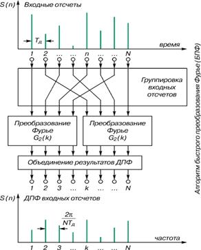 Если выполнять ДПФ входной последовательности, впрямую – строго по исходной формуле, то потребуется много времени (особенно если количество входных отсчетов велико). Конструктивнее использовать принцип «разделяй и властвуй», лежащий в основе алгоритма БПФ. Согласно ему входная последовательность делится на группы (например, четные и нечетные отсчеты), и для каждой из них выполняется ДПФ, а затем полученные результаты объединяются. В итоге получается ДПФ входной последовательности – и существенная экономия времени. Поэтому описанный алгоритм так и назвали – быстрое преобразование Фурье.