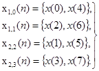 Разобьем исходную N-точечную последовательность х(пТ)=хv (п), где v =log2 N. п=О.. .., N -1, на две (N/2)-точечные последовательности Хv-1,0 (п) и Хv-1,1 (п), состоящие соответственно из четных и нечетных членов х (пТ), т. е.