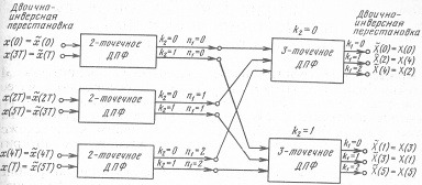 v>O и целое, то процесс уменьшения размера ДПФ может быть продолжен до тех пор, пока не останутся только 2-точечные ДПФ. При этом общее число этапов вычисления ДПФ будет равно v=log2
