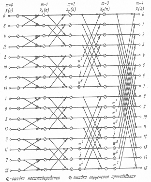 2. Дисперсия ошибки каждого выходного отсчета алгоритма, обусловленной округлением произведений, равна сумме ошибок, 2v-m из которых вызывается ошибками т-й ступени.