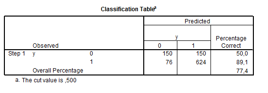 На основе модели логистической регрессии можно строить предсказание произойдет или не произойдет событие {Y=1}. Правило предсказания, по умолчанию заложенное в процедуру LOGISTIC REGRESSION устроено по следующему принципу: если