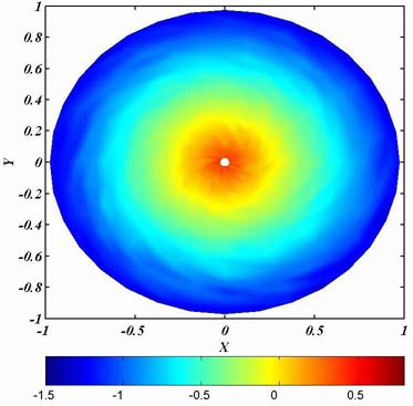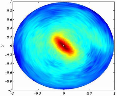 Рис. 1 – Эволюция изолированного звездного диска: а) изолированный тонкий звездный диск с изначально осесимметричным распределением плотности звезд (вид сверху). Ось симметрии проходит через центр перпендикулярно плоскости рисунка; б) диск с баром, развившимся через время, равное нескольким периодам вращения галактики: осевая симметрия распределения плотности звезд нарушена. Рисунки по модельным расчетам А.В. Хоперского.