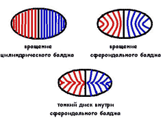 Так выглядит секулярная эволюция изолированного диска в численных моделях, рассчитанных современными астрономами Д. Фридли и В. Бенцем (1993, 1995). В этих же моделях отмечается еще одна любопытная особенность: центра галактики газ может достигнуть, только если он изначально вращался так же, как и звезды. А если газ вращается в другую сторону, то в процессе стекания к центру галактики, он выходит из плоскости диска и образует устойчивое наклонное кольцо. Оно может долго вращаться, не падая на центр, и тогда вспышки звездообразования не будет.