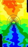 Рис. 4 – Поле скоростей звезд в эллиптической галактике NGC 821, показывающее вращение центра галактики, с наложенными на него центральными изофотами. Синяя половина – приближающаяся к нам часть галактики, а красная – удаляющаяся в процессе вращения. Видно, как область быстрого вращения концентрируется к большой оси – это околоядерный звездный диск. |