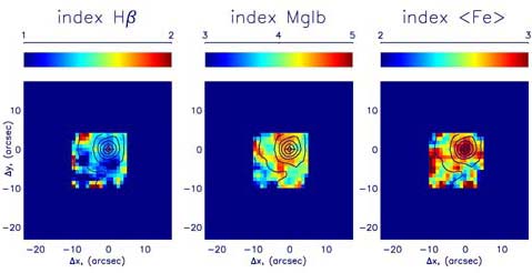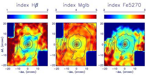 Если в центрах галактик ранних типов с большими балджами (S0 или Sa-Sb) есть компактные звездные структуры, возникшие во вторичной вспышке звездообразования, они должны быть видны не только по форме изофот или изовел. Активное звездообразование – это быстрая химическая эволюция, потому что химические элементы тяжелее азота рождают в основном массивные звезды, которые живут недолго и успевают отдать в межзвездную среду вновь произведенные тяжелые элементы еще до окончания вспышки звездообразования. Поэтому компактные околоядерные диски – продукты вторичных вспышек звездообразования – должны выделяться на фоне окружающих их старых звездных сфероидов более молодым возрастом звезд и повышенным содержанием в них металлов. Двумерная спектроскопия обеспечивает нас полной информацией от протяженного участка галактики, и следовательно, мы можем построить двумерные карты эквивалентной ширины (на самом деле, глубины) линий поглощения в спектре. Линии поглощения в интегральном спектре галактики порождаются более всего звездами, причем известно, какие линии какими именно звездами. Так, за линии поглощения водорода ответственны в основном звезды класса A – довольно массивные, порядка 2М¤, и возраст их не может быть больше 1–2 млрд. лет. Поэтому, грубо говоря, чем глубже линии водорода в интегральном спектре, тем больше относительно молодых звезд в галактике или в галактической структуре, спектр которой мы наблюдаем. Линии поглощения металлов (например, сильный триплет магния на длине волны 5175 ? или многочисленные линии железа) тем глубже, чем больше металличность звезд. Правда, есть один нюанс: в молодых массивных звездах линии металлов всегда слабые (эквивалентная ширина их мала), даже если металличность этих звезд велика. Здесь выручает совместный анализ линий металлов и линий водорода: если их сопоставить, то эффекты возраста и металличности можно разделить и определить одновременно оба параметра.