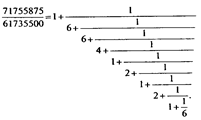 Алгоритм Евклида здесь позволяет определить НОД чисел 71755875 и 61735500, равный 3375 и соответствует разложению отношения 71755875 к 61735500 в цепную дробь: