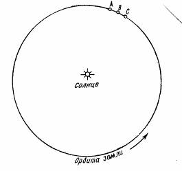 Узаконить в гражданской жизни такую длину года невозможно. А что получится, если принять гражданский год равным ровно 365 суткам? На рис. показана орбита Земля. 1 января 1980 года в 0 часов Земля находилась в точке А. за 365 суток она не дойдёт до точки А и 1 января 1981 года в 0 часов окажется в точке В, а 1 января 1982 года – в точке С и т.д. Получится, что если отмечать положение Земли на орбите, соответствующие фиксированной дате, то оно будет каждый год иное: оно будет отставать почти на 6 часов. За 4 года отставание состоит почти сутки, и фиксированная дата будет попадать на разные времена года, т.е. 1 января с зимы постепенно переместится на осень, потом на лето.