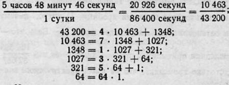 Примечание 2. Чтобы выразить длину года в виде цепной дроби, незачем выражать её десятичной дробью в долях суток (аналогично тому, как мы делали с числом π). Это вычисление производится так (целая часть отброшена):