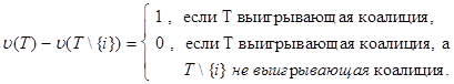 где суммирование по T распространяется на все такие выигрывающие коалиции T , что коалиция T \{i }не является выигрывающей.