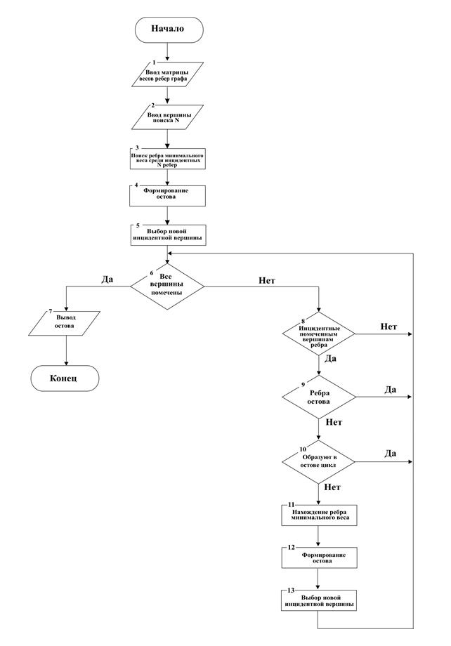 Блок 7. Вывод остова. После того как все вершины графа помечены, на монитор пользователя выводится остов минимального веса.
