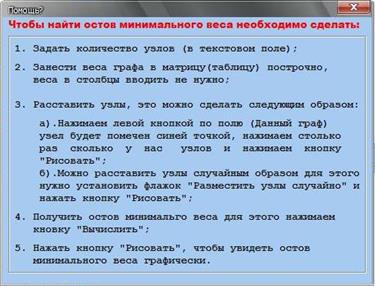 В курсовом проекте в разделе «Постановка задачи» рассматривается теоретический материал по теме «Графовые модели. Остов минимального веса», в разделе «Алгоритм нахождения» рассматриваются алгоритмы нахождения «Остова минимального веса», в разделе «Инструментальные программные средства» выбираются инструментальные средства для разработки программного продукта, в разделе «Операционная среда моделирования» определятся интерфейс программного продукта, в разделе «Контрольная задача моделирования» формулируется задача для ее решения вручную и с помощью программного продукта.