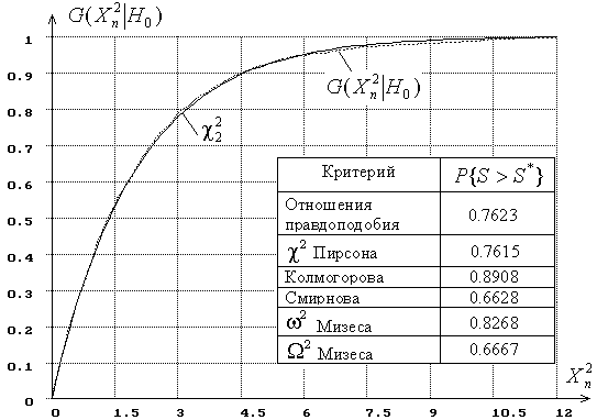 Предположим, что имеем выборку n. Обозначим истинную функцию распределения, которой подчиняются наблюдения, G(х), эмпирическую (выборочную) функцию распределения – Fn (х), а гипотетическую функцию распределения – F(х). Тогда гипотеза Н о том, что истинная функция распределения есть F(х), записывается в виде Н : G(·) = F(·).