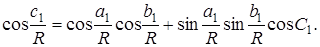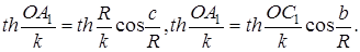 Візьмемо в тривимірному просторі Лобачевского сферу радіуса R із центром у деякій крапці О . На цій сфері індуцирується деяка сферична геометрія. сукупність, Що Виходить, пропозицій називається геометрією сфери в просторі Лобачевского. Розглянемо в цій геометрії прямокутний трикутник AВС , утворений з дуг АВ = з, АС = b , ВР = a більших кіл. Дуги більших кіл тут, як і в сферичній геометрії звичайного простору є найкоротшими для досить близьких крапок на сфері. Кути між більшими колами розуміються як лінійні кути двогранних кутів, утворених площинами більших кіл. Припустимо, що кут З даного трикутника прямої. Опустимо далі із крапки В перпендикуляри ВА1 і ВР1 на радіуси ОА й ОС відповідно. Застосовуючи відомі формули до прямокутного трикутника ОВС1 (мал. 20), одержимо