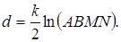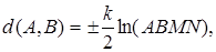 Ця формула показує, що відстань між двома крапками А и В рівняється з точністю до множника подвійному відношенню даних крапок А, У и крапок М, N перетинання прямій АВ з абсолютом.