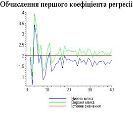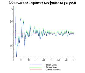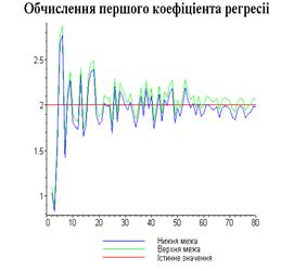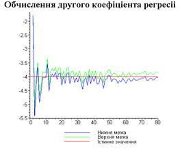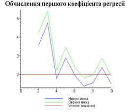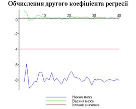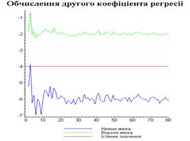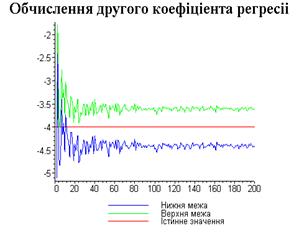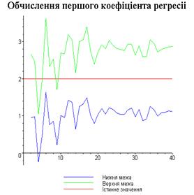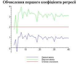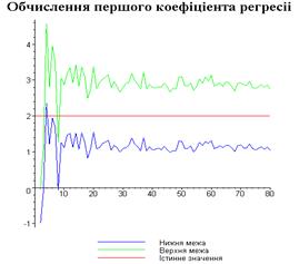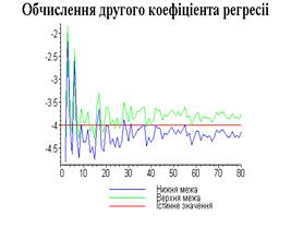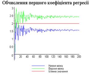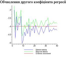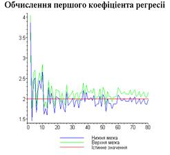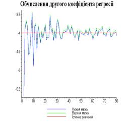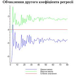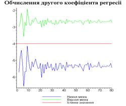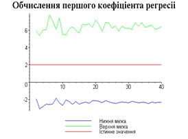 За допомогою розроблених програм в цьому ж розділі наведено результати експериментального дослідження залежності величин інтервалів, які накривають коефіцієнти регресії в залежності від об’єму вибірки та величин інтервалів в яких знаходяться значення координат вибірки.