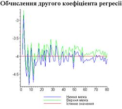 З одержаних результатів випливає, що починаючи з деякого об’єму вибірки спостерігається стабілізація, тобто різниця між верхньою та нижньою границею інтервалів, що накривають параметри регресії, перестає зменшуватись. Тому використовувати вибірки об’ємом більше, ніж це порогове значення є недоцільним, бо це не дає поліпшення результатів. Цей поріг, де починається стабілізація, не залежить від вектора похибки і приблизно дорівнює 50.